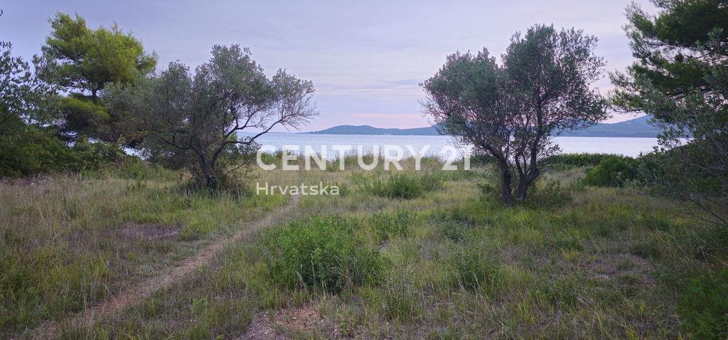 Biograd na Moru, Kumenat, an exceptionally attractive seaside land plot in a tourist zone, with an area of 4010 m2. It has a rectangular shape. Its shorter side, 30 m long, borders directly on the pebble beach. From the sea, on an almost flat, gently sloping terrain, it extends 134 m all the way to the access road, which is in private ownership. An easement right could be obtained for its unobstructed use.