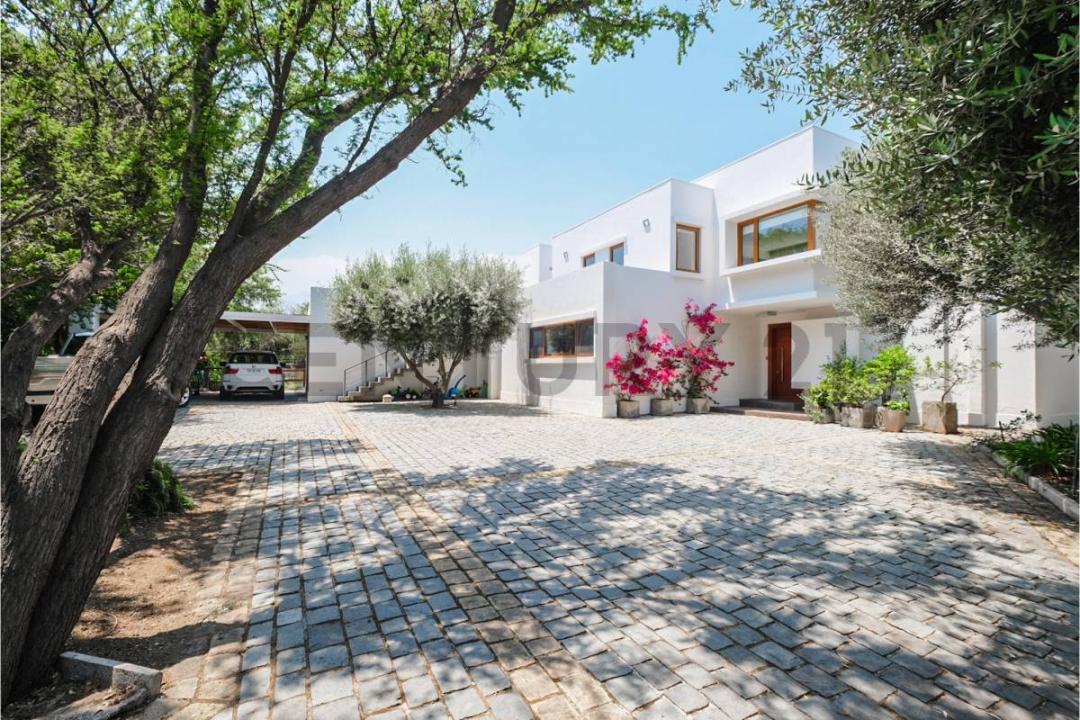 En primer piso, llegas a un gran hall de entrada donde está el bano de visita, distribuye a amplios espacios donde se encuentran, living, comedor separados, con salida a terraza, con telón retráctil. Por otro lado esta una gran cocina con mesa de comedor de diario, repostero, artefactos Miele, despensa, bodega, lavadero, sector de servicios, con salida a patio techado con estanterías que conecta al garaje. En la otra ala se encuentra el dormitorio principal que sale a una linda terraza rodeada de vegetación, tiene sala de estar, bano con Jacuzzi y gran walking closet .