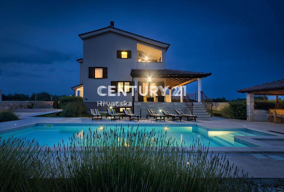 This beautiful holiday home with a swimming pool is located in a very quiet village, only 6 km from Svetvinčent, and 16 km from the first beach.In the basement there is a multifunctional space for fitness and a boiler room.The ground floor consists of a living room with a kitchen and a dining room, a bedroom with a bathroom, an additional bathroom, and an anteroom with a washing machine and a clothes dryer. It also has access to a large terrace with a view of the sea.The first floor consists of 3 more bedrooms, each with its own bathroom and hall, and one with access to the terrace with a view of the sea.Within the landscaped grounds there is a heated swimming pool with a sunbathing area, a covered grill with a sitting area, a children's playground, a sports field (16m x 8m) for indoor soccer, basketball and volleyball, minigolf, and a 5-person hot tub. Irrigation is also installed on part of the lawn.In terms of equipment, the house has air conditioners in all rooms, TV/SAT connections, alarm system and video surveillance, smoke sensors.The insulation is 10 cm of graphite styrofoam, and the whole house has triple PVC joinery with Low-e glass filled with gas.An ideal opportunity to invest in tourism due to the well-established tourist rental business!